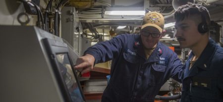 200427-N-KY668-1022 ATLANTIC OCEAN (April 27, 2020) Lt. j.g. Alexander Canales (right) and Electricians Mate 1st Class Curtis L. Campbell (left) examine the readings in aft steering aboard the Arleigh Burke-class guided-missile destroyer USS Roosevelt (DDG 80) on the Atlantic Ocean, April 27, 2020. Roosevelt is on patrol in the U.S. 6th Fleet area of operations in support of regional allies and partners, and U.S. national security interests in Europe and Africa. Roosevelt will replace USS Carney (DDG 64) as one of four forward deployed naval forces (FDNF) in Spain. (U.S. Navy photo by Mass Communication Specialist Seaman Austin G. Collins/Released)