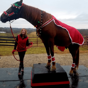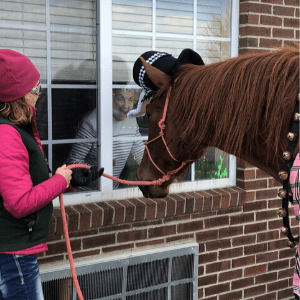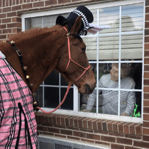 Tammi Regan runs a rescue horse foundation named “For Hank’s Sake.” It began 8 years ago when Tammi rescued Hank, a Tennessee Walking Horse that had been neglected, starved, left alone and found in horrible condition. Tammi nursed Hank back to health and helped him grow to be an ambassador for those in need, whether it be humans or animals. Through Tammi’s efforts Hank has blossomed into a horse of a lifetime. Among his many charitable efforts is volunteering for the Salvation Army. Hank rings the bell for the Salvation Army @ Xmas. Last year he raised over $5,ooo. Hank, along with Tammi, visits nursing homes to cheer the senior citizens & has made window visits during the Covid crisis to surprise & put some cheer in their day. His latest adventure was this Easter Sunday. Hank (with Tammi in tow) visited a young boy named Talon in Lexington who has had several heart operations & is a big Hank fan. Hank performed tricks, posed for photos and paraded thru the neighborhood for all to enjoy.