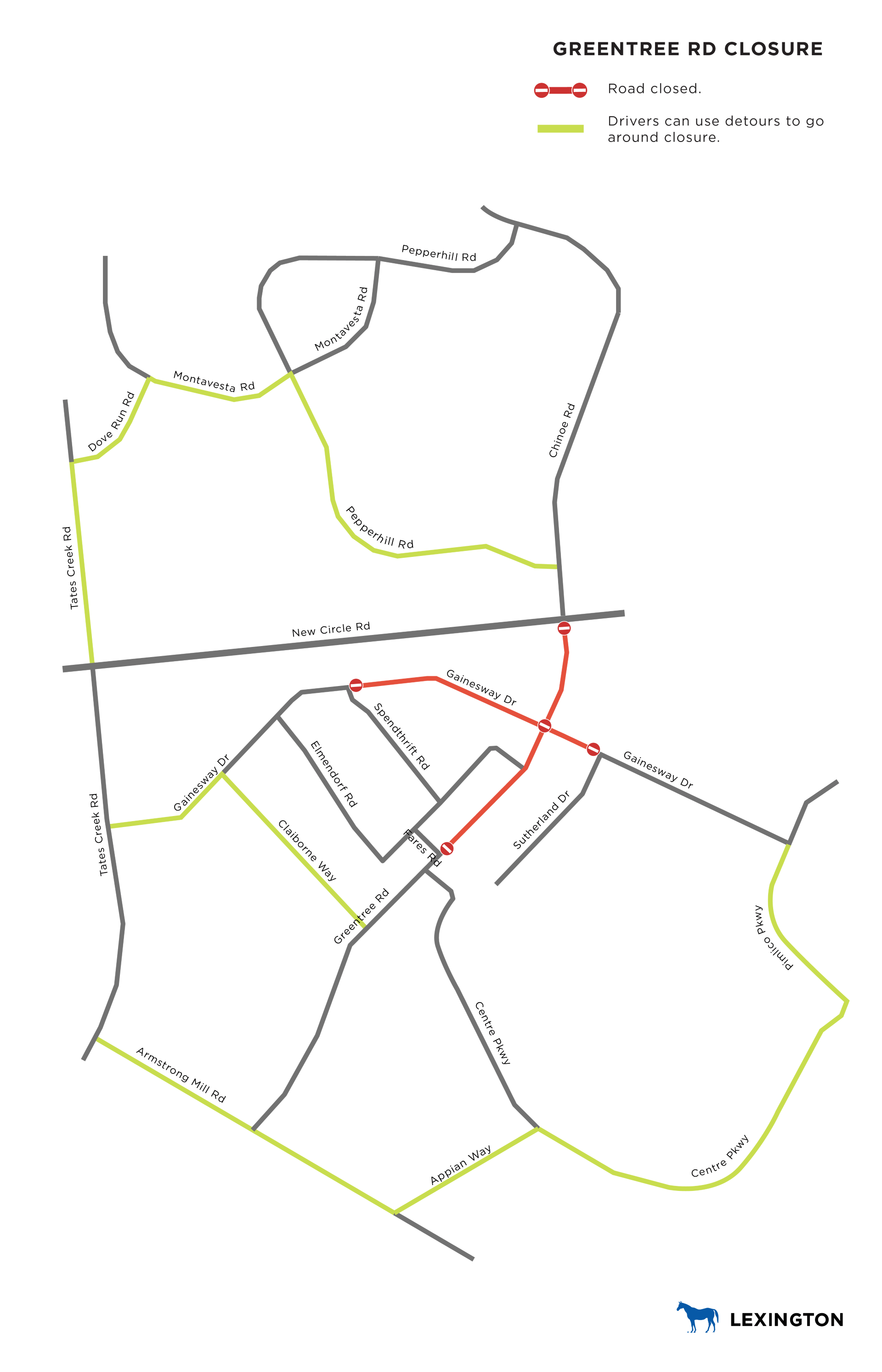 · Commuters turning onto Gainesway Road from Tates Creek Road can travel Claiborne Way to Greentree Road to reach Armstrong Mill Road and Centre Parkway.