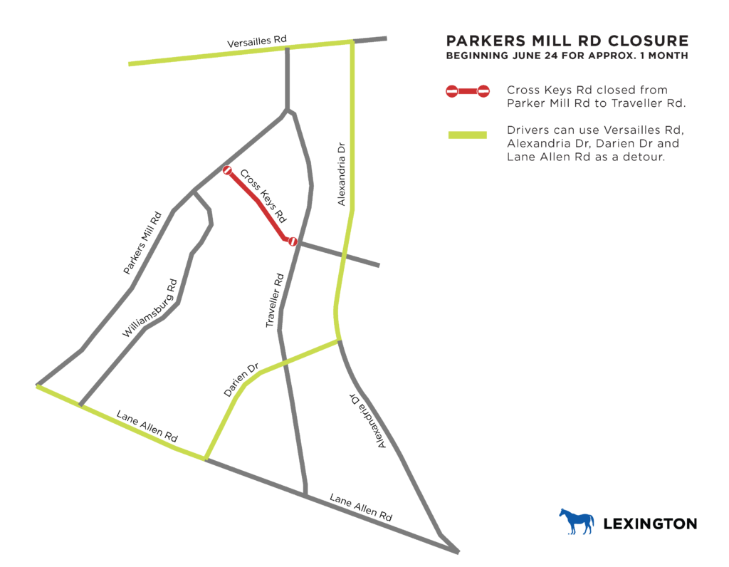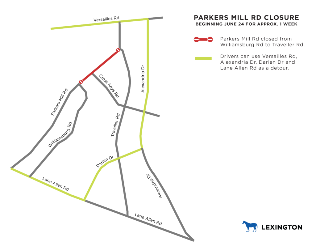 Parkers Mill Road will be closed for approximately one week from from Williamsburg Road to Traveller Road. Drivers can use Versailles Road, Alexandria Drive, Darien Drive and Lane Allen Road as a detour route.